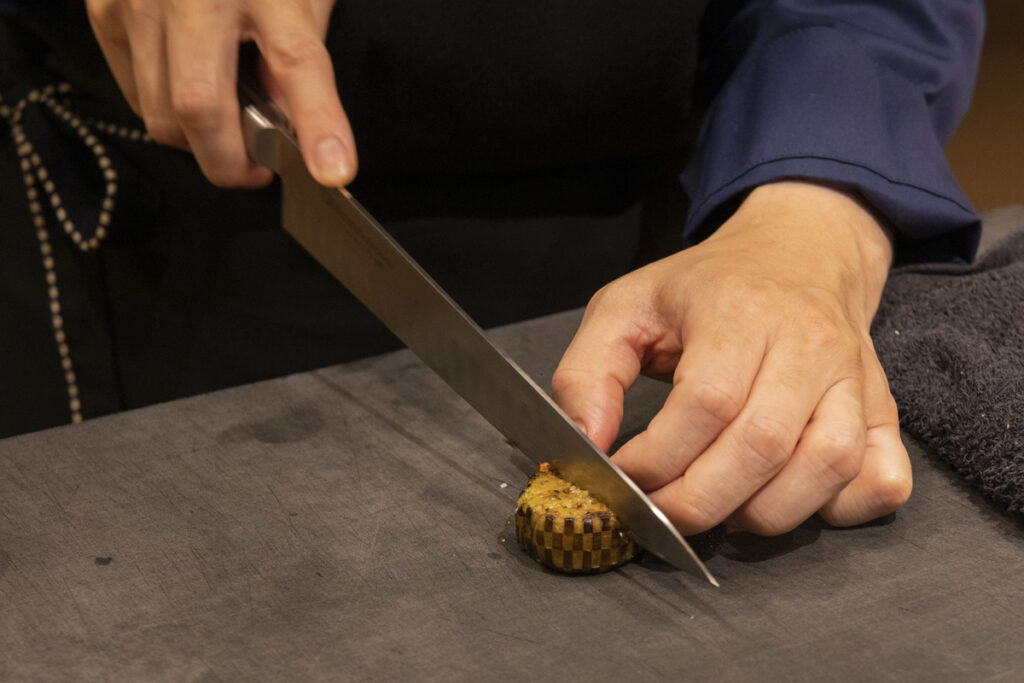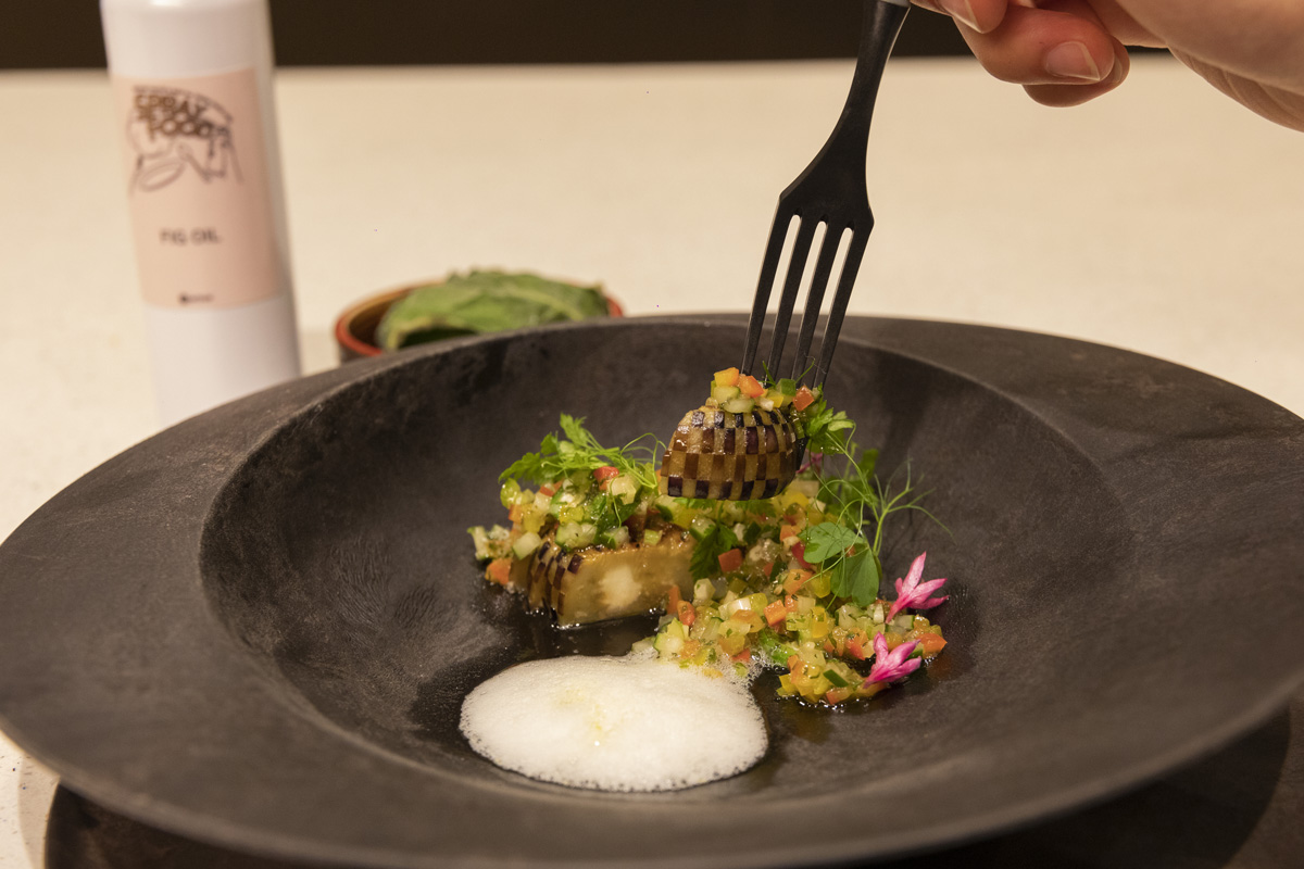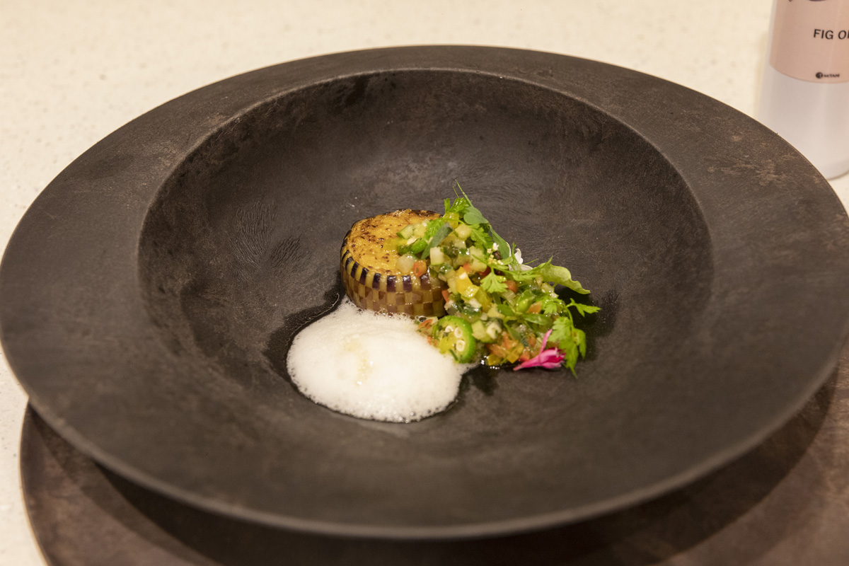 こちらは食材の育まれる畑や土地を表現した、野田さんのシグネチャーディッシュ。市松模様のように美しく皮を剥いたナスをイチジクの葉の香りをうつしたオイルで焼き、葉で包んで加熱。仕上げにイチジクの葉で香りづけしたオイルを、スプレーフードでふわりと吹きかけました。