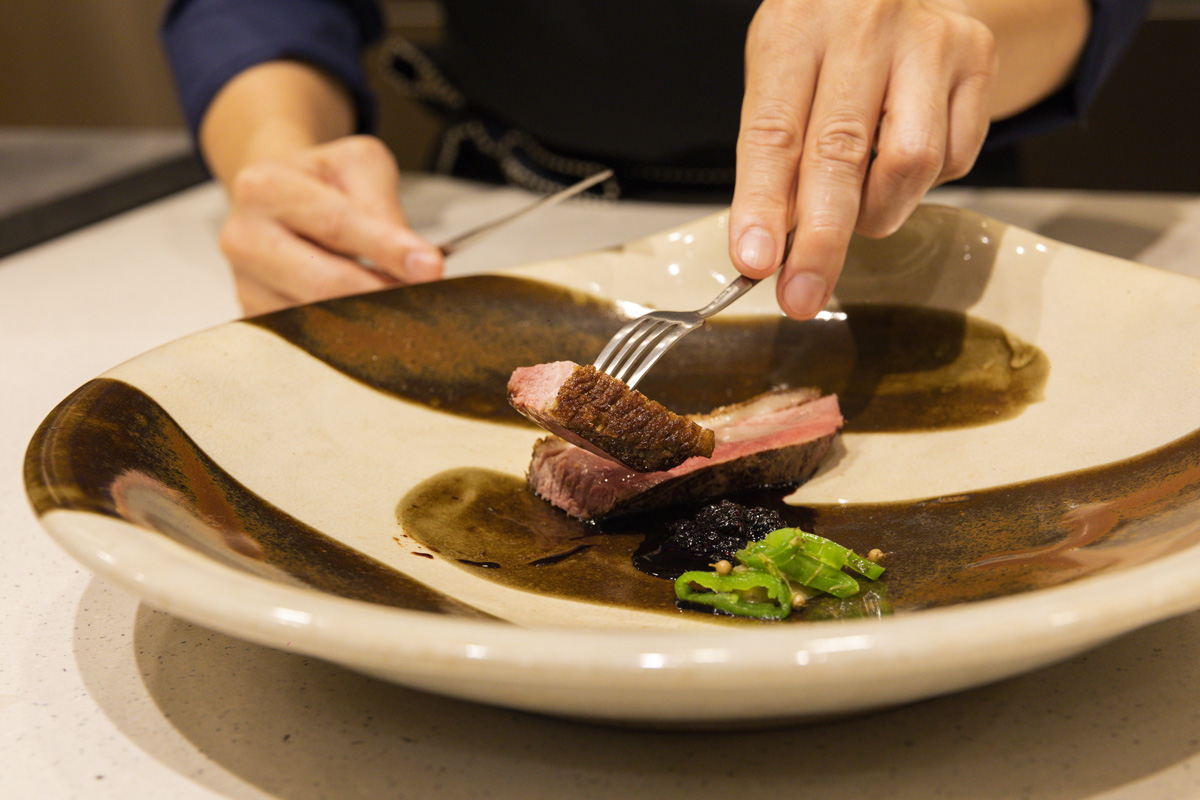 続いては、滋賀県高島市の近江鴨を低温でじっくり焼くことで柔らかくジュ―シーに火入れしたこちら。ラベンダーオイルのスプレーフードを吹き付け、炭火焼きで仕上げました。そこにローストした赤タマネギと赤ワインのうまみを凝縮させたソースを合わせます。