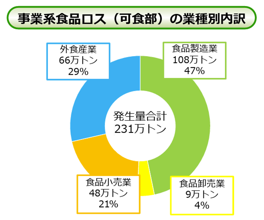 事業系フードロスは、食品関連事業者から発生するロスを指し、231万トン(2023年度)を占めています。業種別の内訳を見ると、食品製造業が108万トンと最も多く、続いて外食産業66万トン、食品小売業48万トン、食品卸売業9万トンとなっています。