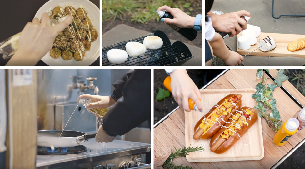 そして、そのBOV技術を活用した製品として「スプレーフード」があります。スプレーフードとは、食用油や調味料、食品香料などをスプレー容器から噴射できる形にした全く新しい食品です。まるでコスメのように押すだけで、ミスト状やストレート状に液体を均一に噴射することができます。