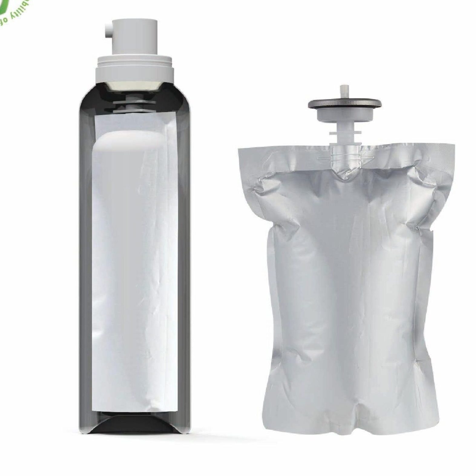 BOV(バッグオンバルブ)は、内容物を外気と完全に遮断する容器技術です。容器内部にアルミパウチが設置されており、その中に油が充填されています。使用時は外側の空間に充填された圧縮ガス(窒素ガスなど)の圧力によってパウチが押され、内容物だけが吐出される構造です。