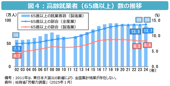 ただし長期的に見ると深刻な構造変化が進行しています。若年層(34歳以下)の就業者数は減少傾向にある一方で、高齢層(65歳以上)の就業者数は増加しており、「労働力の高齢化」がはっきりと表れているのです。2002年からの推移を見ると、この傾向は一貫して続いており、近年はほぼ横ばいで推移していますが、根本的な解決には至っていません。