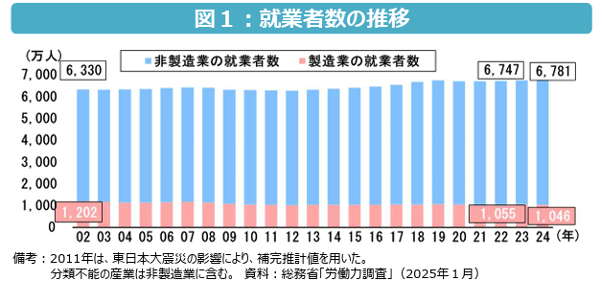 製造業の就業者数は約1,046万人(2024年)と依然として巨大な雇用を支えています。この数字は日本の労働者の約7人に1人が製造業に従事していることを意味し、第二次産業が雇用面でも経済の重要な柱であることを示しています。